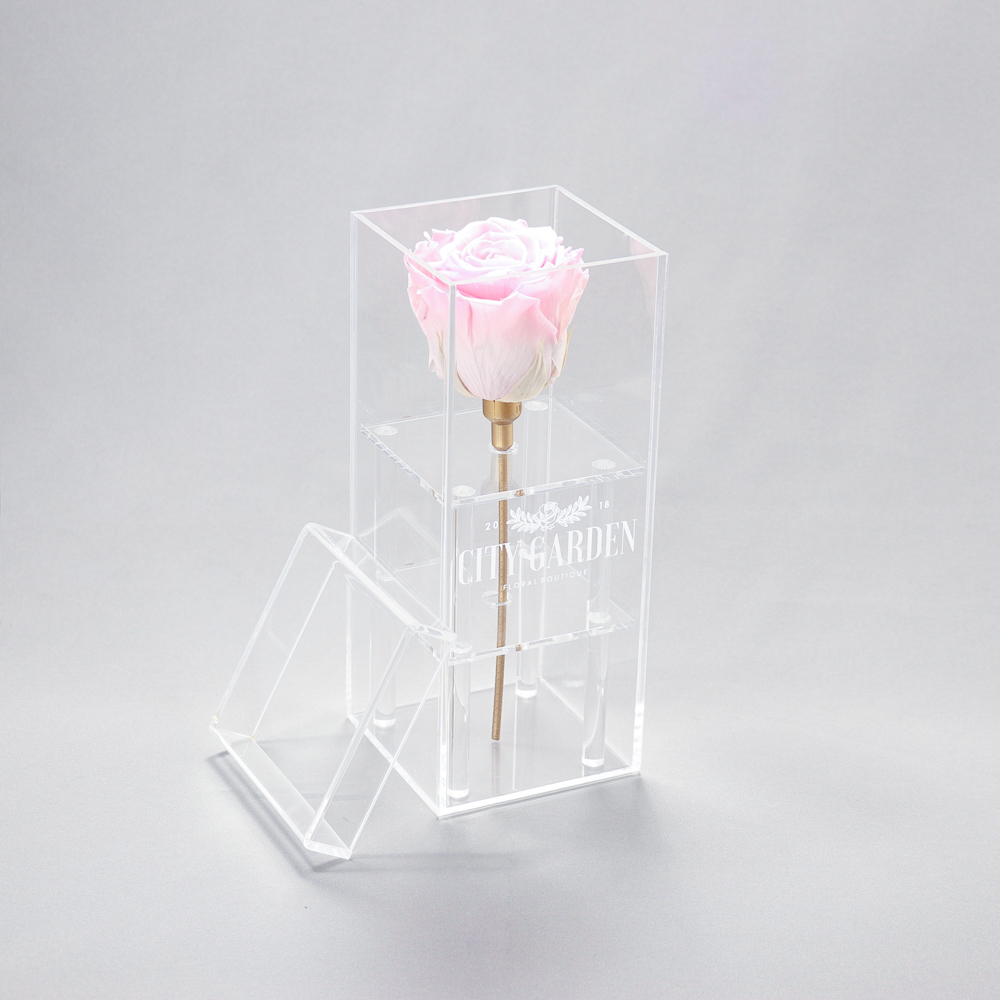 Displayed here is our Solitaire Bloombox, which is a part of our Eternity Rose Collection. Our roses are special since they are capable of maintaining their freshness in full bloom, and hold a life span of one year. We offer our Eternity Roses in a variety of beautiful colours yours to choose. Roses are showcased in our premium quality acrylic boxes.